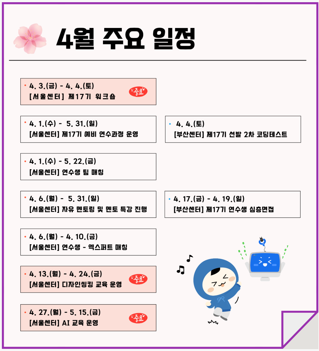 - 명확한 커리큘럼이 없기 때문에 오히려 일정이 난잡해지기 마련이고, 특히나 예비 연수 기간 동안은 비정기적 일정이 매우 많이 발생하므로, 자주 까먹게 될 것입니다.